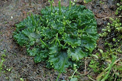 It is usually found on damp banks amongst other bryophytes. This image shows sporophytes developing on the thallus.