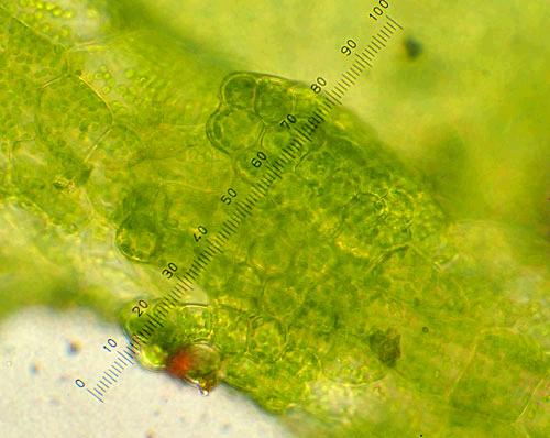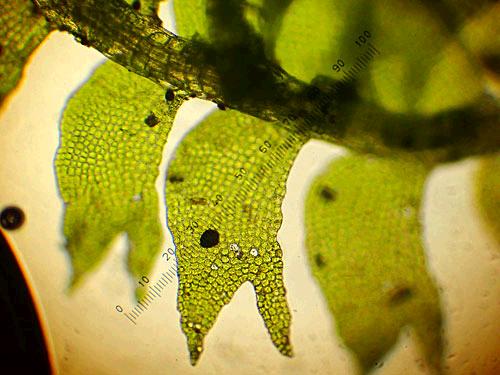 This genus may appear to be like a Bazzania, but the leaf never has 3 teeth. Instead it is unequally bifid, as shown in the next three images.