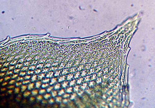 This image shows the border of the leaves of Distichophyllum pulchellum with its long cells. Note also the single vein ending about two-thirds of the way up the leaf.