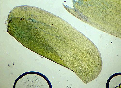 The distinctive shape of a leaf of Homalia falicifolia showing the inflexed margin on one side.