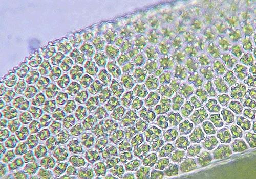 This photo shows the papilla (protuberance) on the leaf cells of this species.