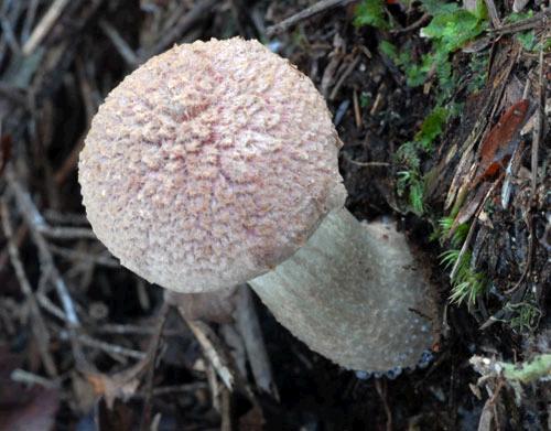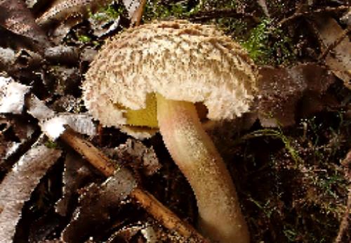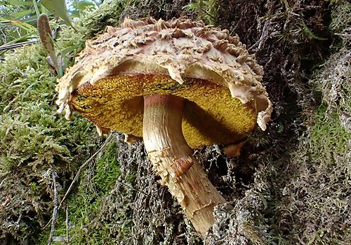 Known as the pineapple bolete, this mushroom grows on soil and on tree trunks. The cap is covered with squamules which range in colour from reddish brown to red-tan, to pink to pinkish grey. Cap diam: up to 50 mm. The pores are bright yellow to olive yellow to mustard yellow.