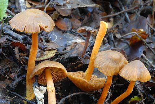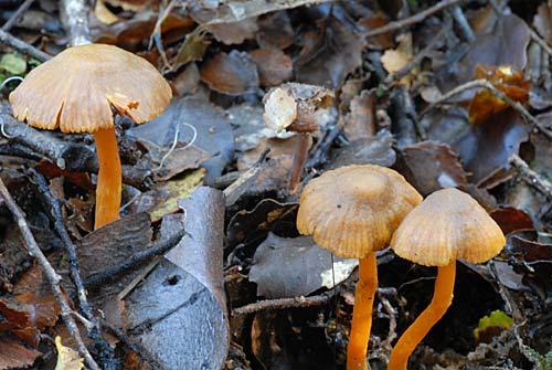 This species has a dry yellow-brown cap with a slightly striate edge. Cap diam: up to 40 mm. The gills are orange-brown. The stipe is distinctively orange. Under beech.
