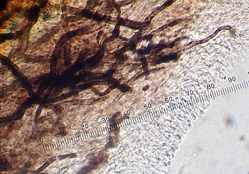 At first glance I though this was a Pluteus as it was growing on wood. When I picked one I found that it turned black where tissues had been damaged. By the time I got the specimen home it had turned completely black.