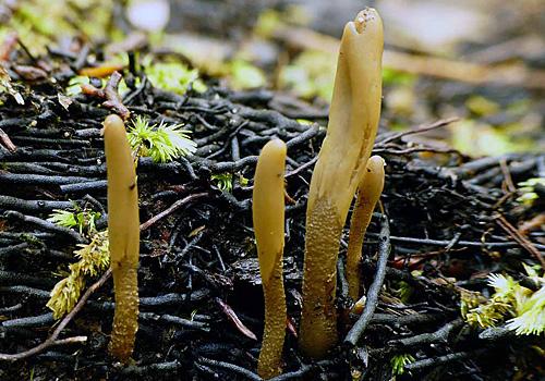 An olive green earth tongue, 40–50 mm tall. There is also a red-orange species, Microglossum rufum.