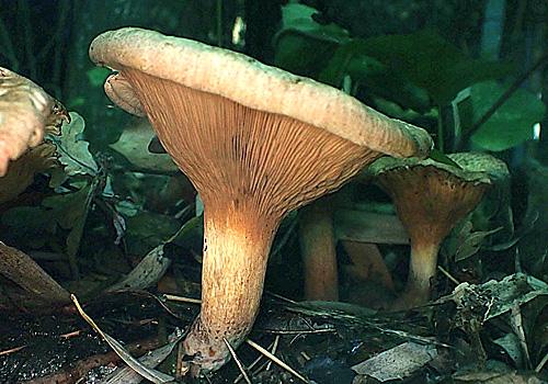 An introduced fungus found under silver birch and hazel trees. It is funnel-shaped, brown with creamy gills which darken with age. Cap diam: 40–120 mm.