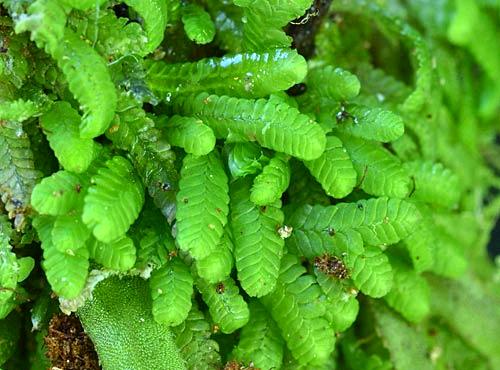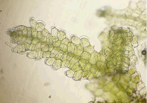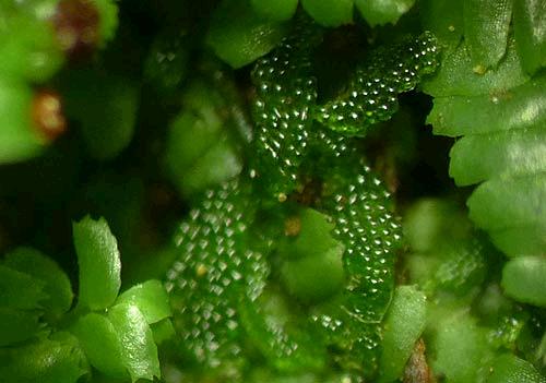 The underside of Lembidium nutans. The underleaves aren't very obvious, but the serrated apex of them is just visible.