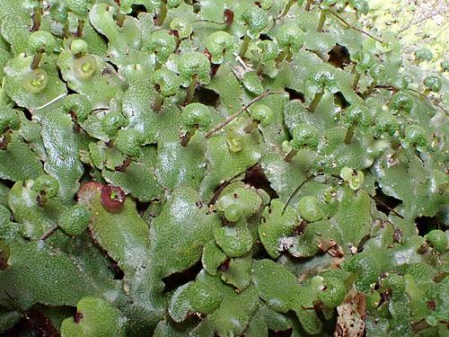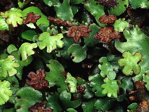 This image shows both male (brown) and female (green) reproductive structures. The male structure is called an antheridiophore, while the female structure is called an archegoniophore. The female structure is not as finely divided as in M. foliacea.