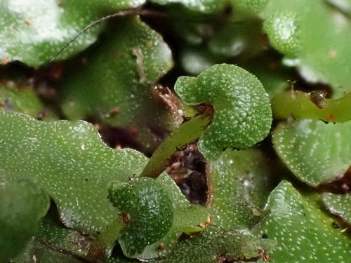 The Marchantia species are found not only in the bush, but also in gardens, plant pots - anywhere it is cool and damp. The thallus (the vegetative growth of a plant which isn't divided into stem and leaves) is waxy-looking, often with little circle things (gemmae cups). At certain times of the year little star-shaped structures on stalks appear and these can make the plant more noticeable.