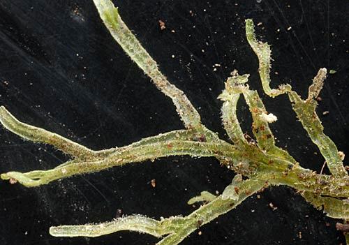 This species has hairs densely scattered on the underneath side, including the edge of the thallus.