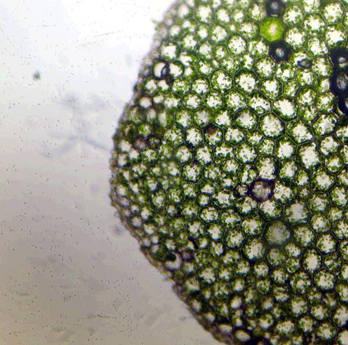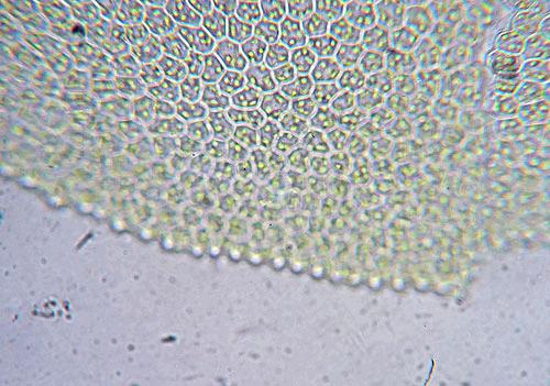 This image shows the border of the leaves of Distichophyllum pulchellum with its long cells. Note also the single vein ending about two-thirds of the way up the leaf.