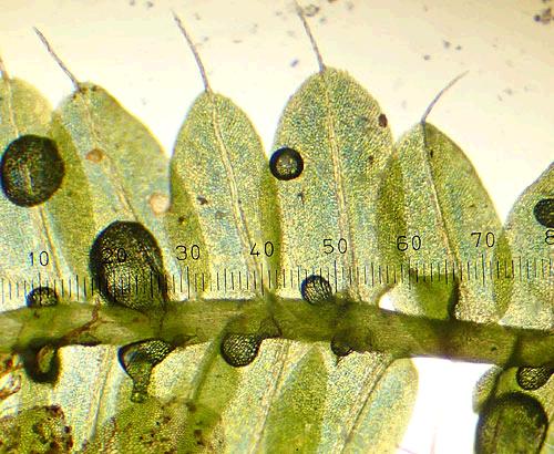 Racopilum has two distinctly different shaped leaves.There are two rows of dorsal leaves, although they may appear to be one row. These are triangular in shape and like the lateral leaves, have a long fine hairpoint consisting of the nerve.