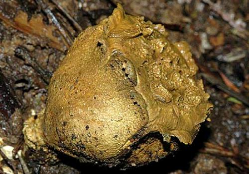 An exotic golden yellow species with a lobed appearance. The gleba (spore mass) is olivaceous at first, becoming grey. On maturity the fruiting body opens up to resemble an empty earthstar (Geastrum). Diam: 40–60 mm. They are mycorrhizal with tea tree and Eucalyptus
