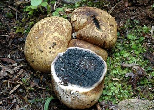 An exotic species found under introduced trees such as oak. The outer skin is tough. Diam: 30–40 mm. The dark material inside the cut specimen is the spore mass.