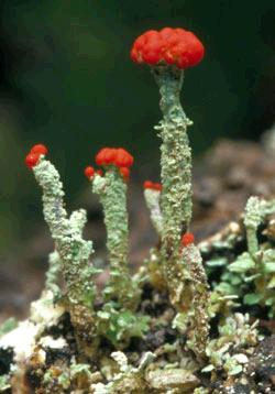 Many lichens are dull grey or green-grey colours, not something to catch the eye, but others like Cladonia floerkeana shown here, are quite colourful. (The red knobs are a reproductive structure).