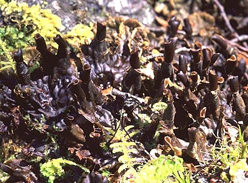 The colour of this dark lichen is caused by the photosynthetic partner being the blue-green alga, Nostoc.
